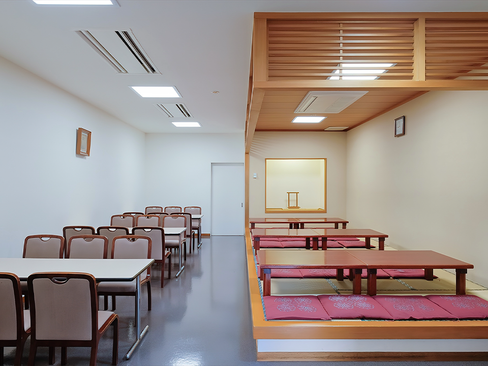 待合室は、和室と洋室が融合した快適な空間です。座敷と椅子席の両方を備えており、ご家族やご友人がリラックスしてお待ちいただけます。落ち着いた雰囲気の中で、心安らぐ時間をお過ごしいただけます。